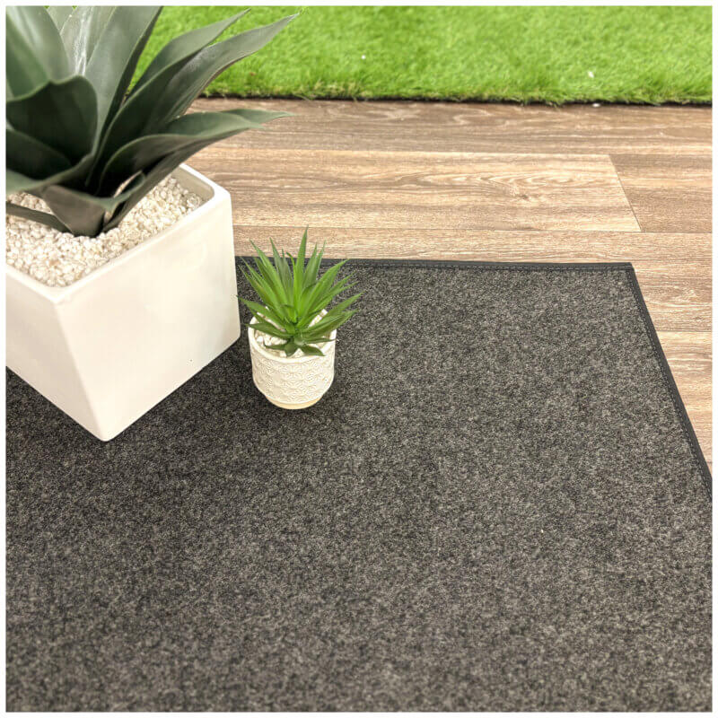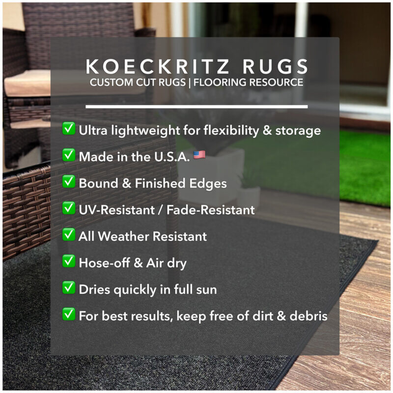 Black Ice Gray Indoor-Outdoor is made from recycled plastic bottles. Carpet Area Rug is Easy to clean – just hose off and dry! Made of 100% Synthetic PET Recycled plastic bottle fiber. PET fiber advantages are its strength, colorfastness and comfort, stain, mildew, abrasion and sunlight resistance. Each Area Rug comes with a Premium Soft Fabric bound edge that nicely finishes your rug. These outdoor rugs are a much better alternative to artificial grass in both look and quality.