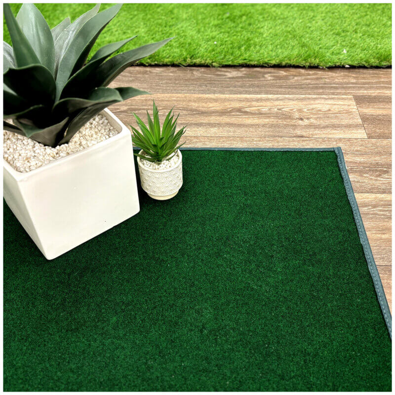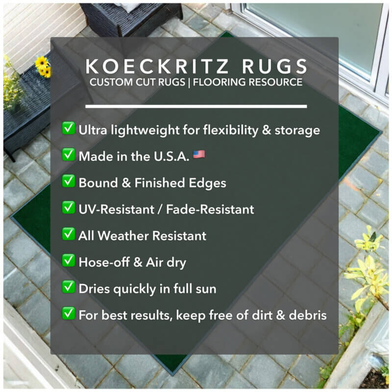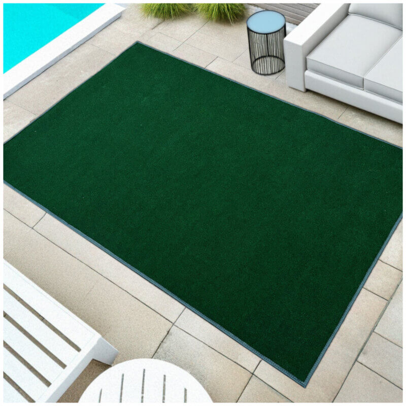 dark Green Indoor-Outdoor is made from recycled plastic bottles. Carpet Area Rug is Easy to clean – just hose off and dry! Made of 100% Synthetic PET Recycled plastic bottle fiber. PET fiber advantages are its strength, colorfastness and comfort, stain, mildew, abrasion and sunlight resistance. Each Area Rug comes with a Premium Soft Fabric bound edge that nicely finishes your rug. These outdoor rugs are a much better alternative to artificial grass in both look and quality.