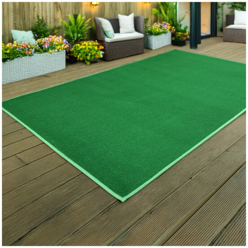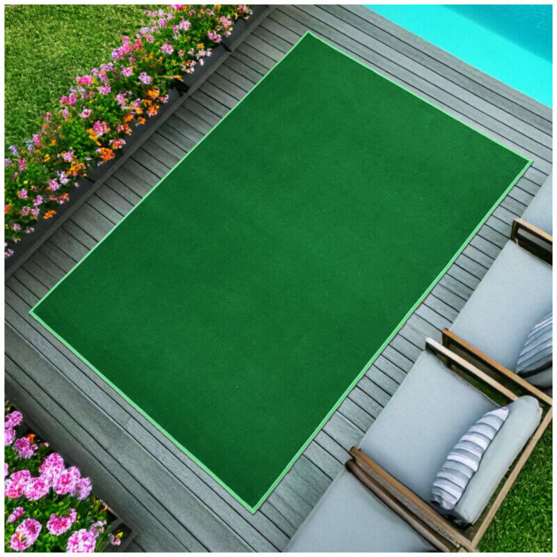 Soft Back backing and made of 100% Synthetic Fiber fiber. Synthetic Fiber’s advantages are its strength, colorfastness and soft comfort. Also stain, mildew, abrasion and sunlight resistance. Keep your rug looking its best by vacuuming or sweeping away dirt and debris. Use a soft bristle broom or hose attachment for vacuuming when dry. Each Jade Green rug comes with a Premium Soft Fabric bound edge. Nicely finishes your rug. These outdoor rugs are a much better alternative to artificial grass in both look and quality. Lightweight and easy to roll for storage. Grommets available upon request. Grommets help hold your carpet of rug in place outdoors. You may request this at the time of checkout.